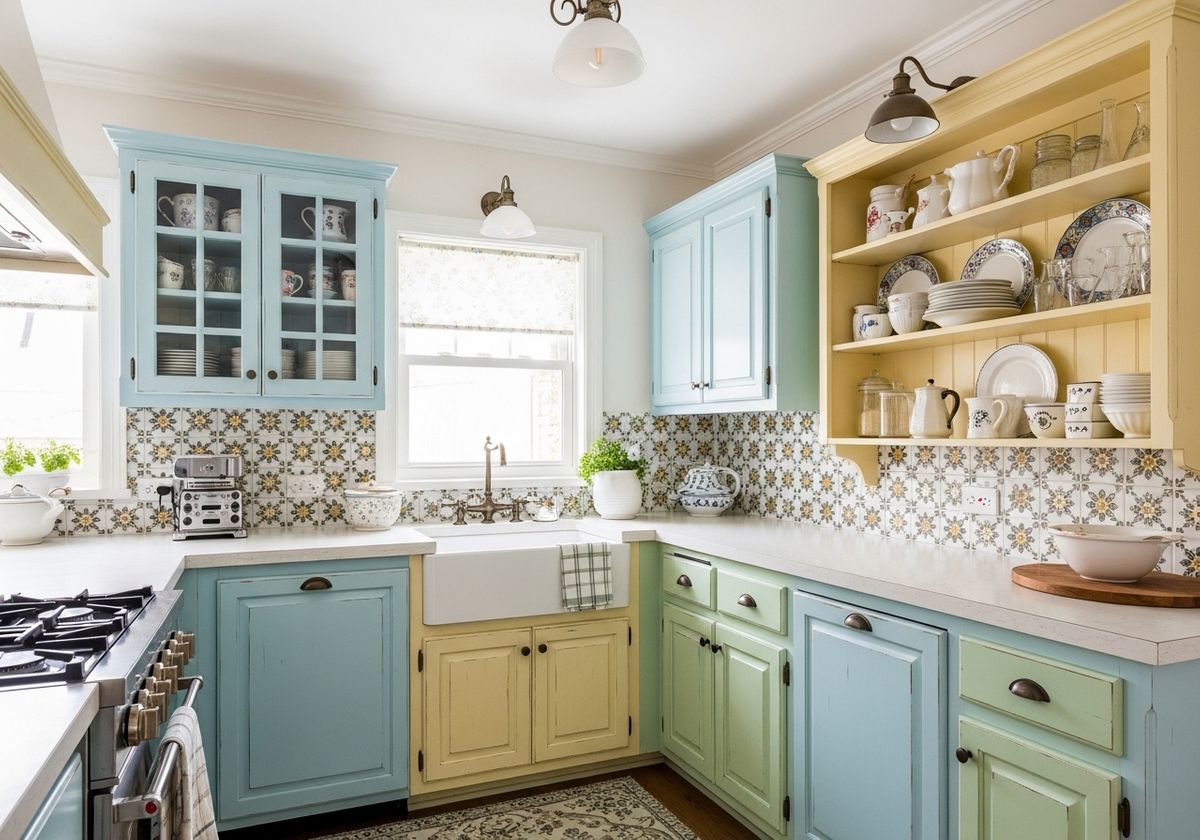 Painted Cabinets: Choose pastel colors such as light blue, green, or yellow for your cabinets. Distressed finishes add to the vintage feel.