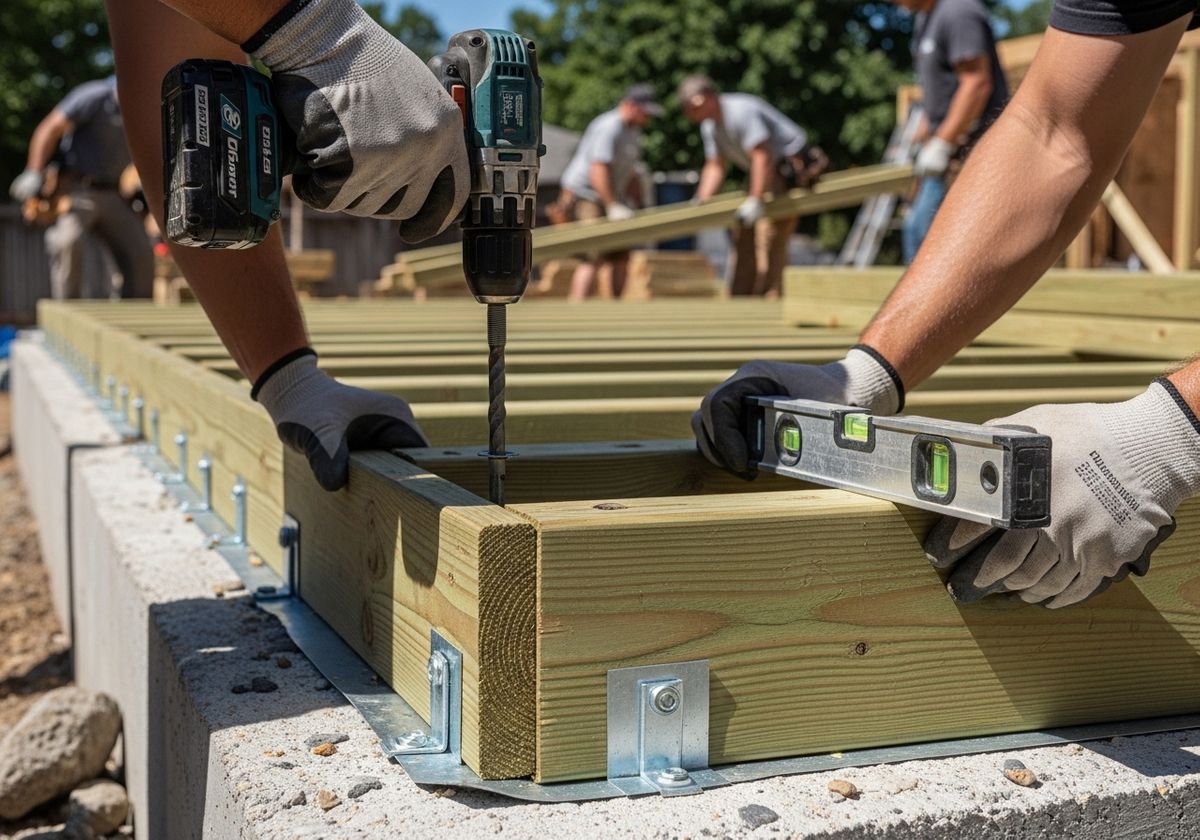 Decking: Install the decking boards, ensuring proper spacing and fastening.